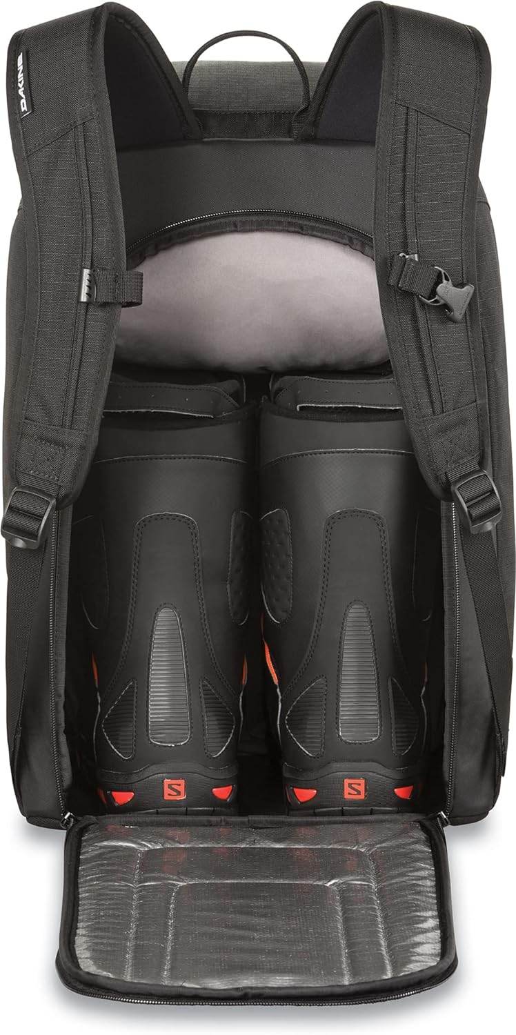 The Dakine 50-liter Boot Pack is built for organized, worry-free gear transport. With dedicated storage for boots, helmet, goggles, and more, this pack keeps everything in its place. A padded helmet and goggle pocket protects against dings, while the zippered front cargo pocket is ideal for gloves, hats, or an extra base layer. The rear-entry panel offers easy access to a separate boot compartment, ensuring your gear stays clean and well-organized. Perfect for moving your entire kit from home to the resort and back again.